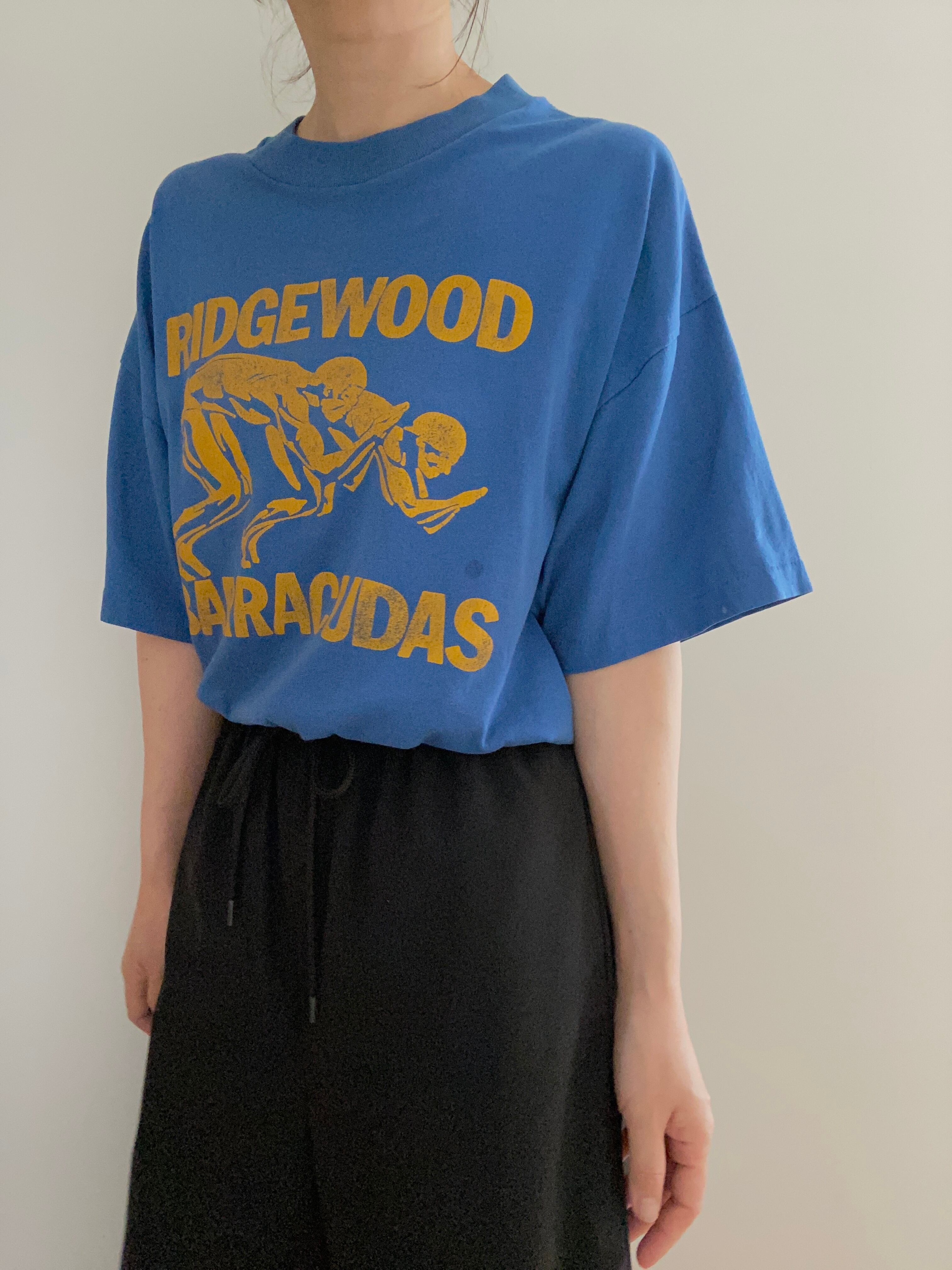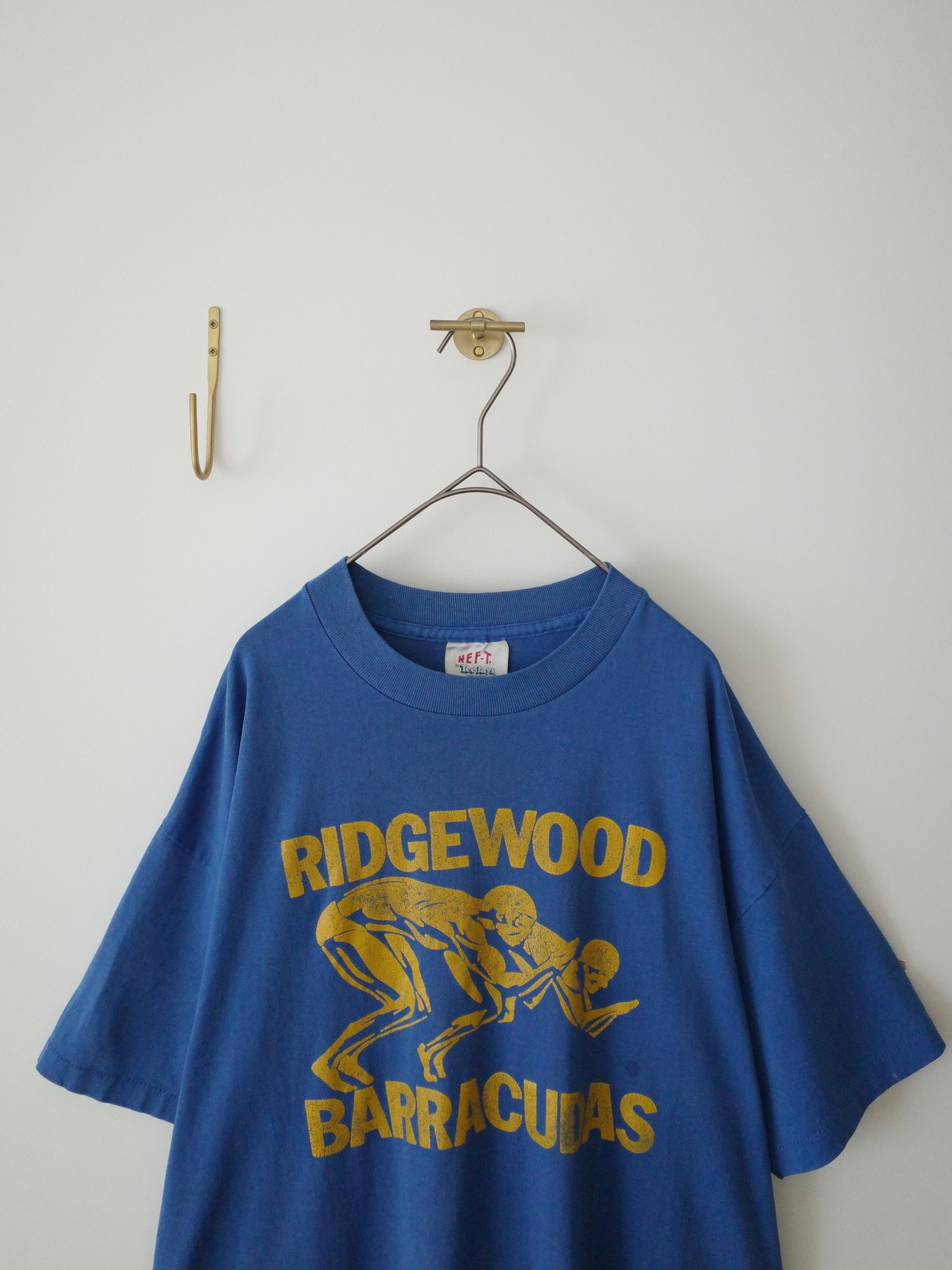 80's〜90's頃の配色が可愛いトレーニングTシャツ。リッジウッドのスイミングクラブのようです。バラクーダとは別名【鬼カマス】と呼ばれる獰猛な魚のことで、強いチームになる事を願って名付けられたのでしょうか☺︎