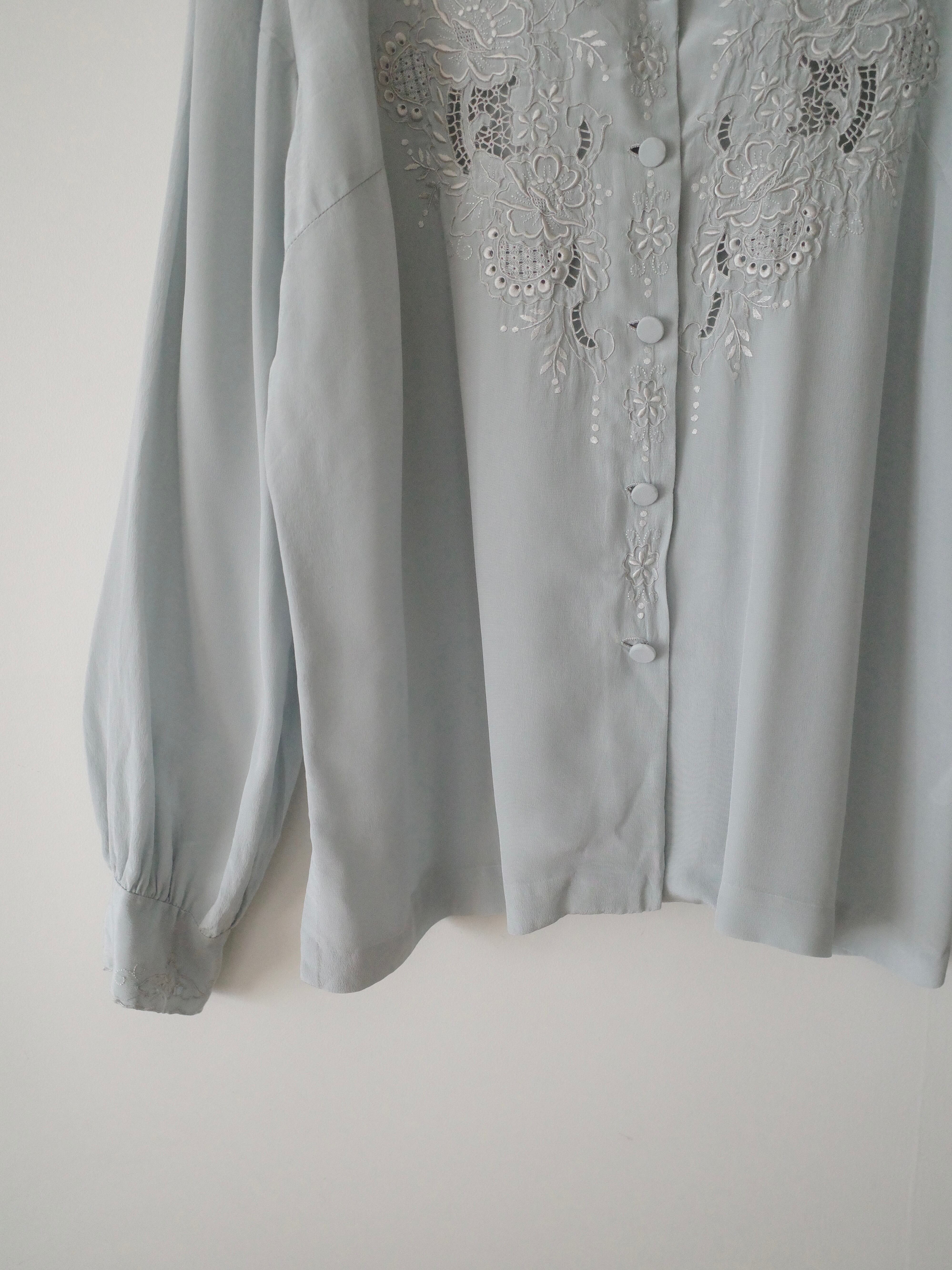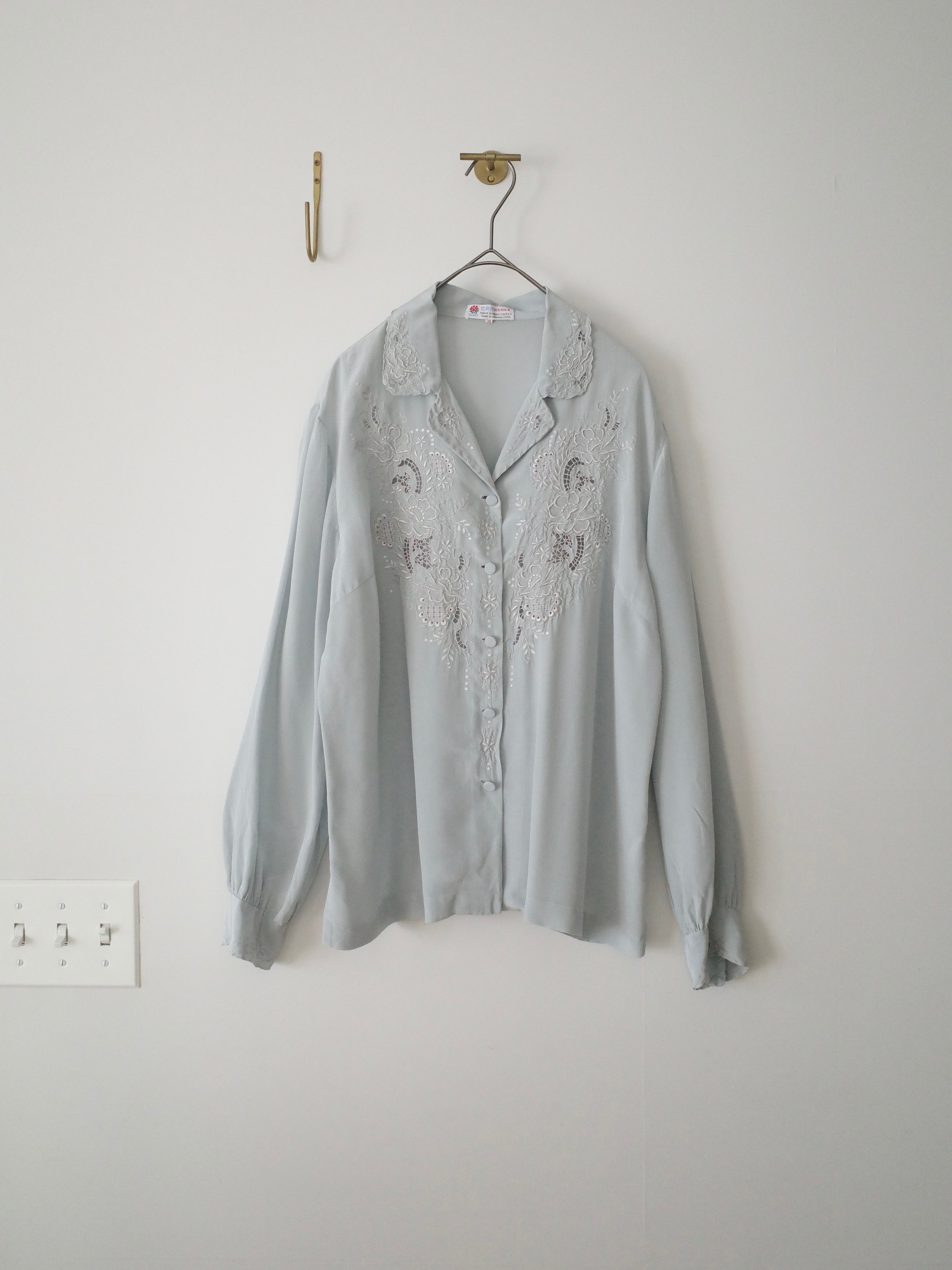 繊細な刺繍が襟にも袖口にも丁寧に施されていて、眺めているだけで目の保養になる1枚。