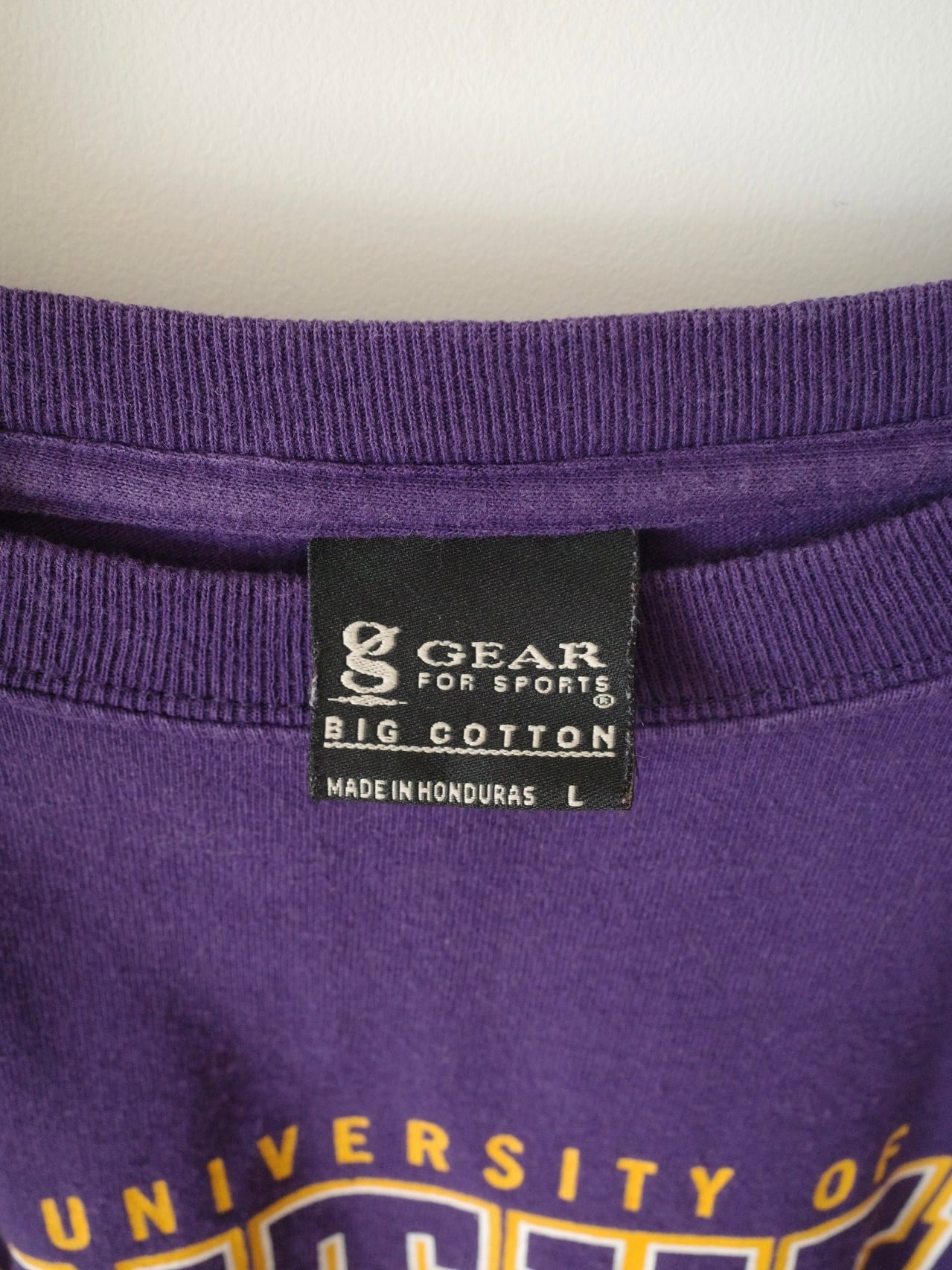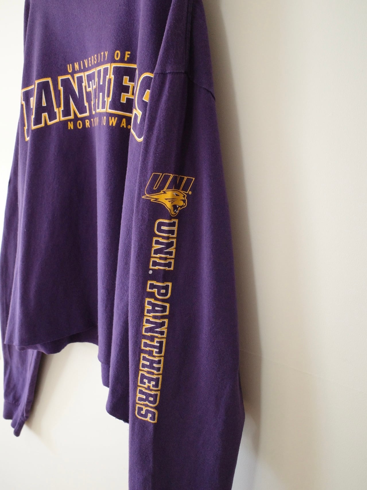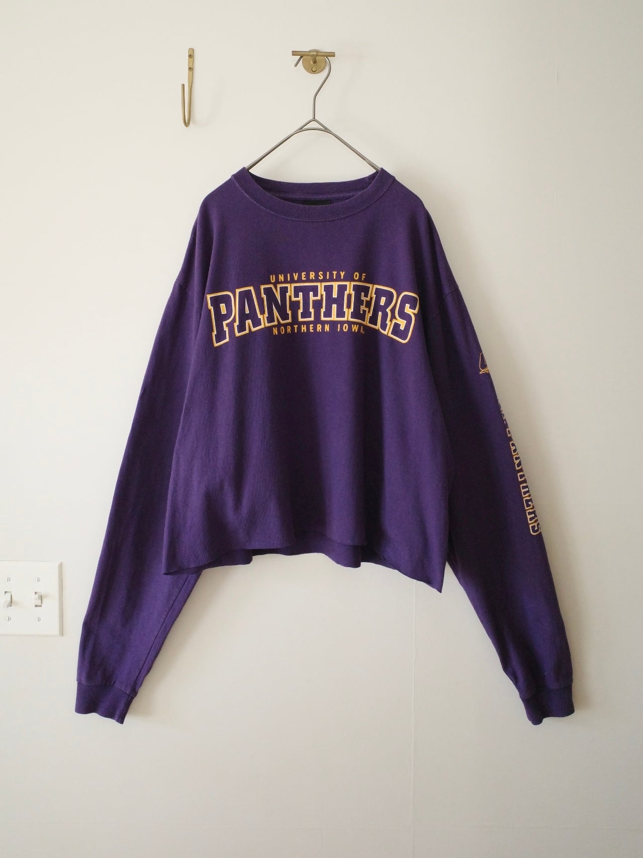 ノーザンアイオワ大学のスポーツチーム『パンサーズ』のロゴがバストとアームに入った配色も可愛いロンT。