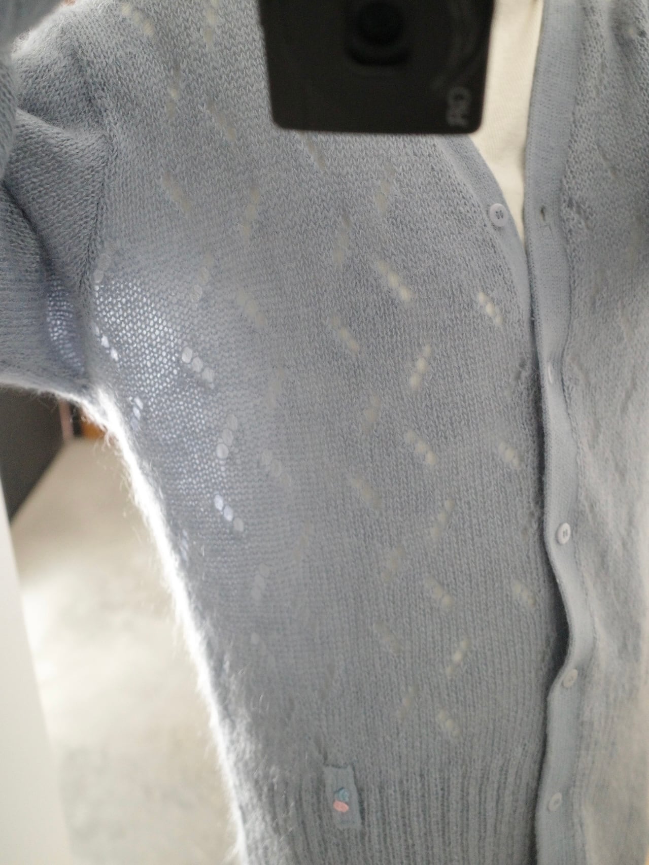グレイッシュなブルーの色味が可愛い、ふわふわなカーディガン。ベビーニットの様な前見頃の透かし編みも柔らかな雰囲気で素敵です☺︎
