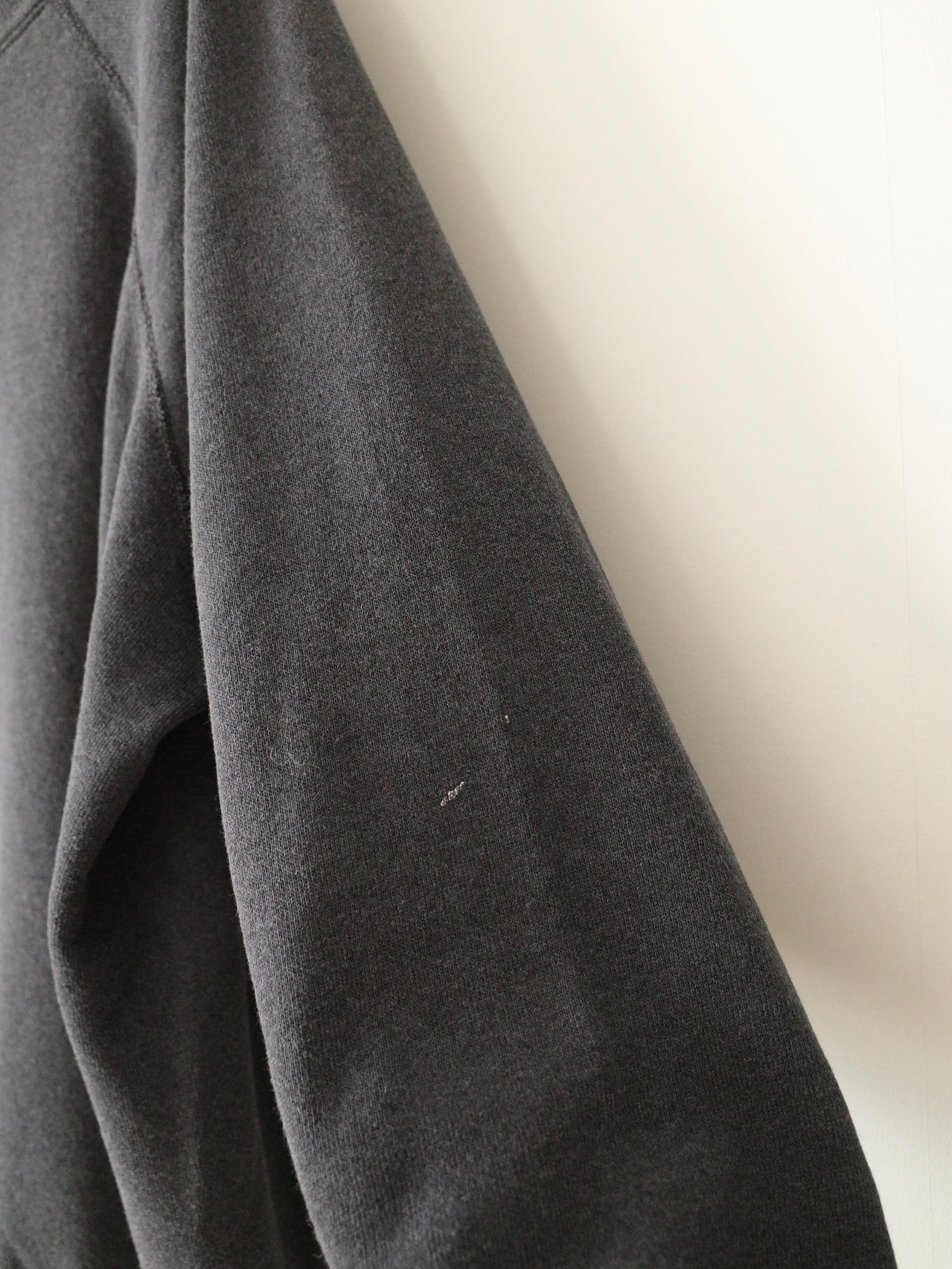 小さな穴(写真8枚目)やペンキ跳ね(写真9枚目)有り。袖口にはリブが無く、切りっぱなし風にロックミシン。このボロ具合と炭黒にフェードした絶妙な色合いがたまりません☺︎