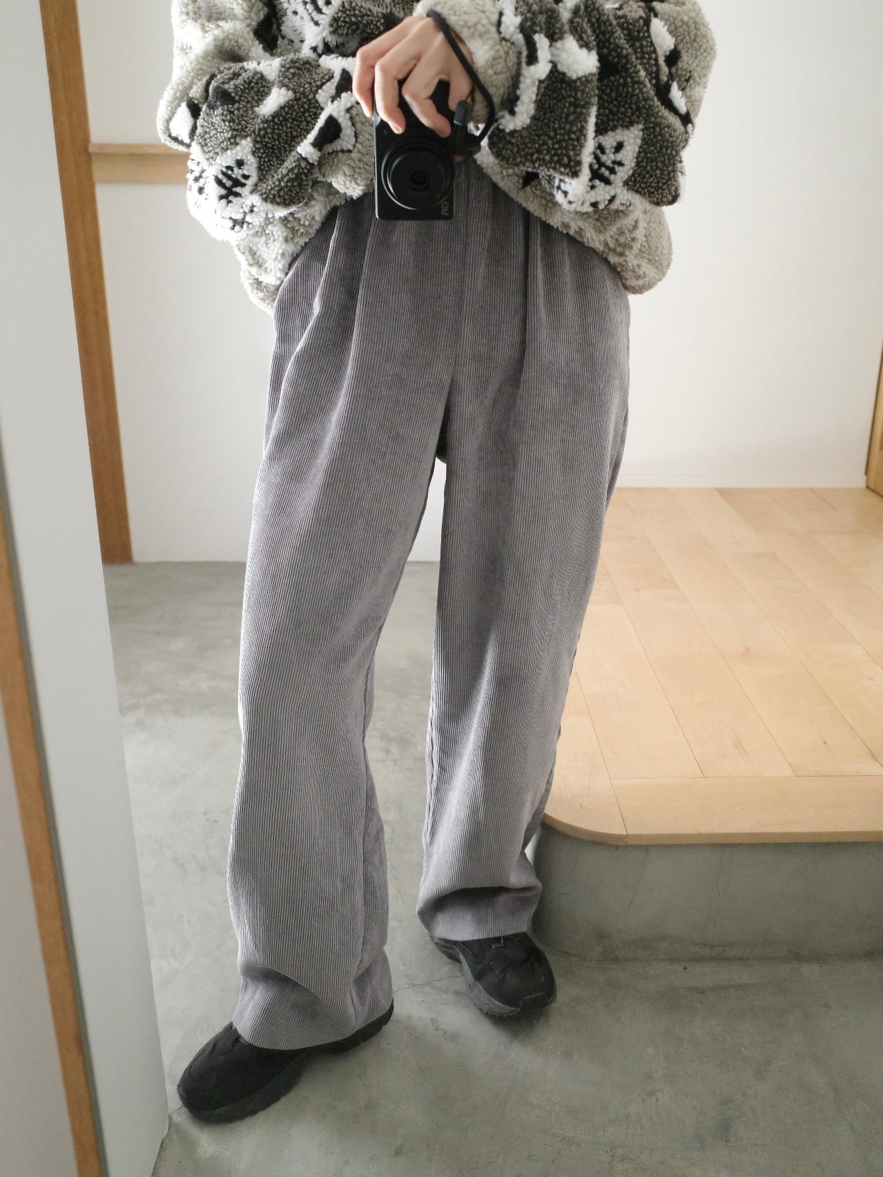 ウエストゴムが楽ちんなのに落ちるシルエットが綺麗なコーデュロイパンツ。お色はグレー。