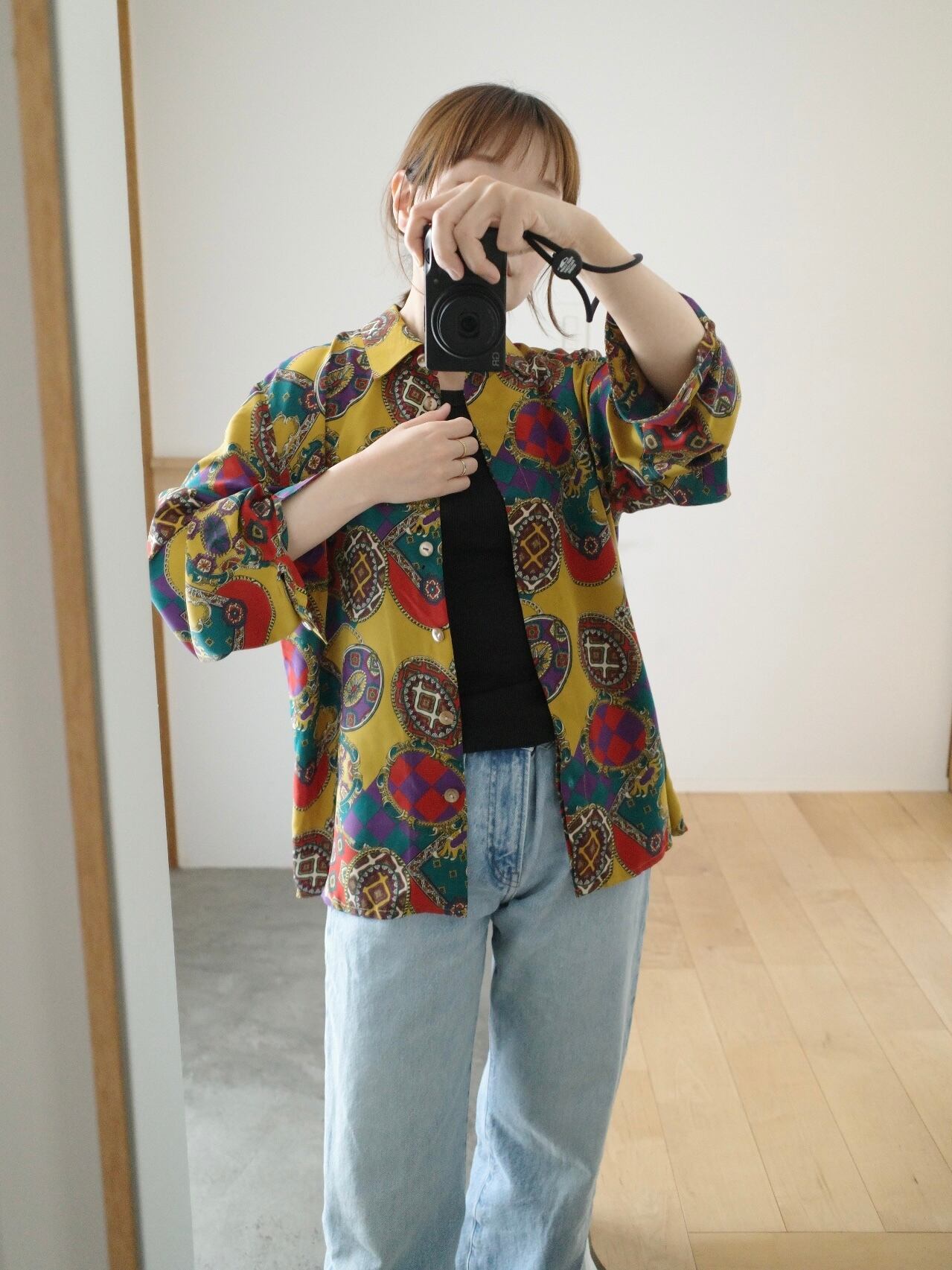 大胆なバロック調のスカーフ柄と、パキッとした色合いが最高なシルクシャツ。派手さの中に落ち着きのある品性を感じられるのは、さすがオールドバーバリー◎
