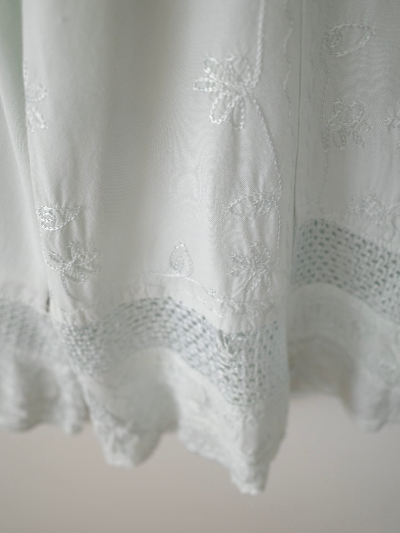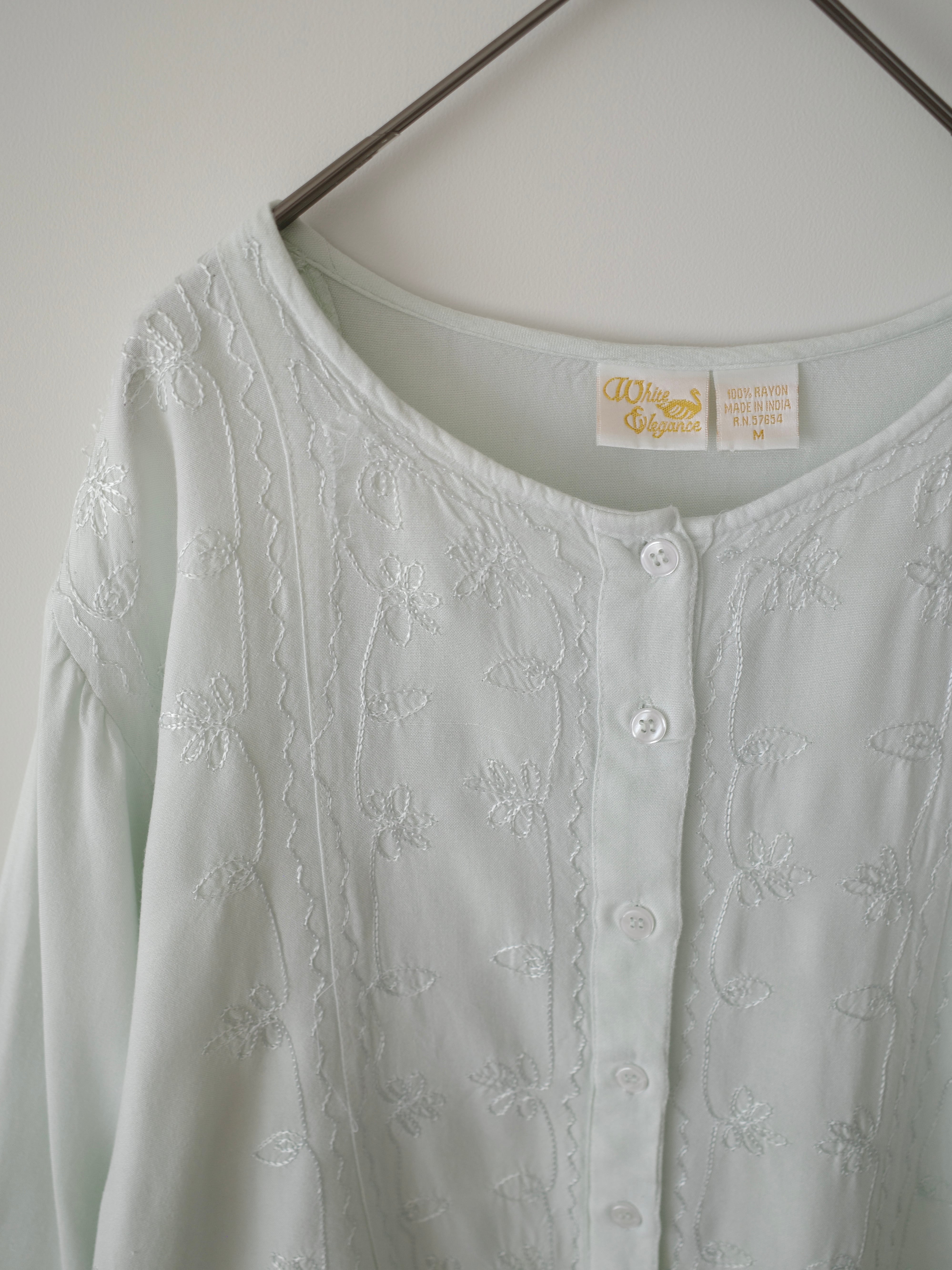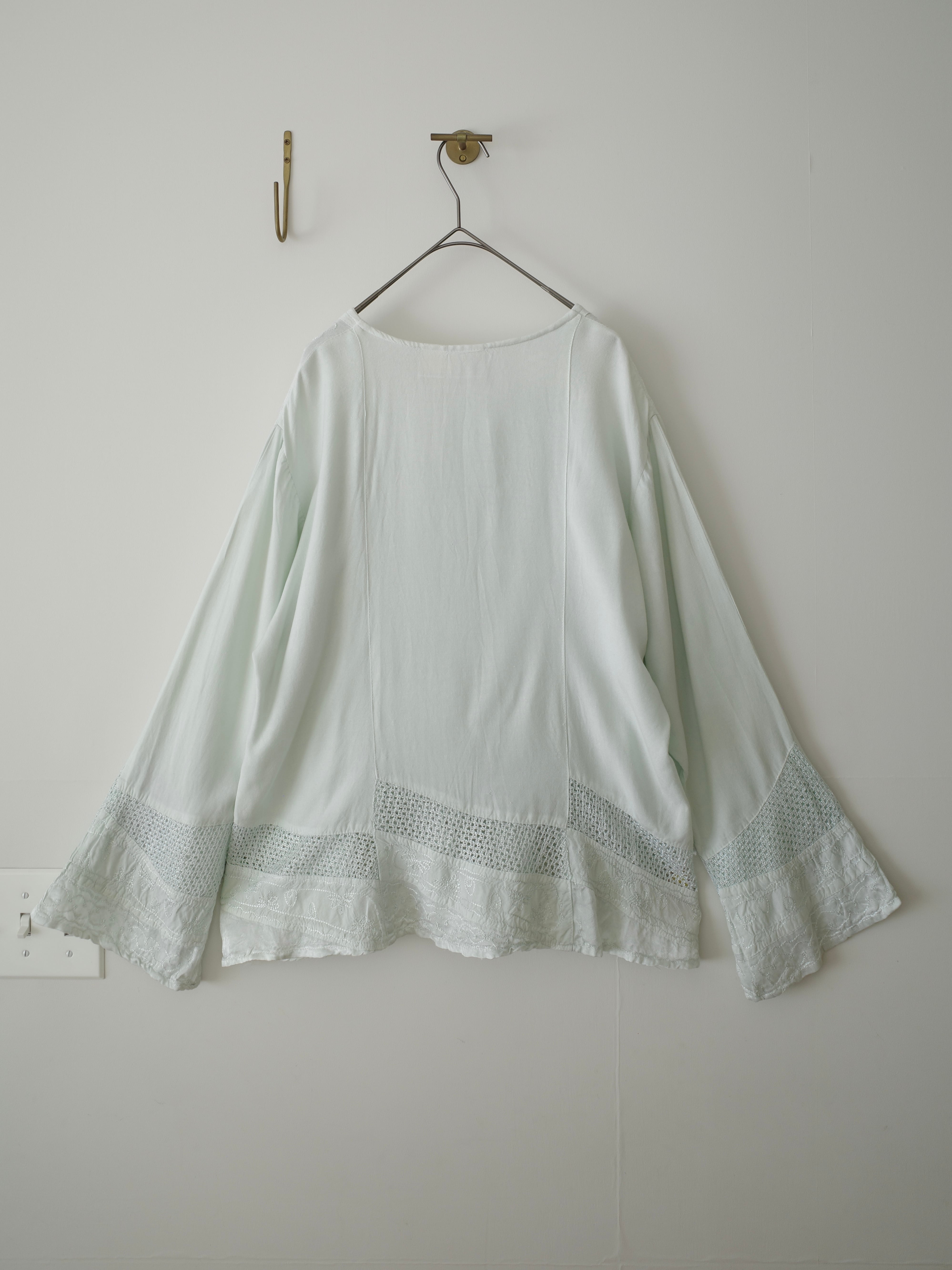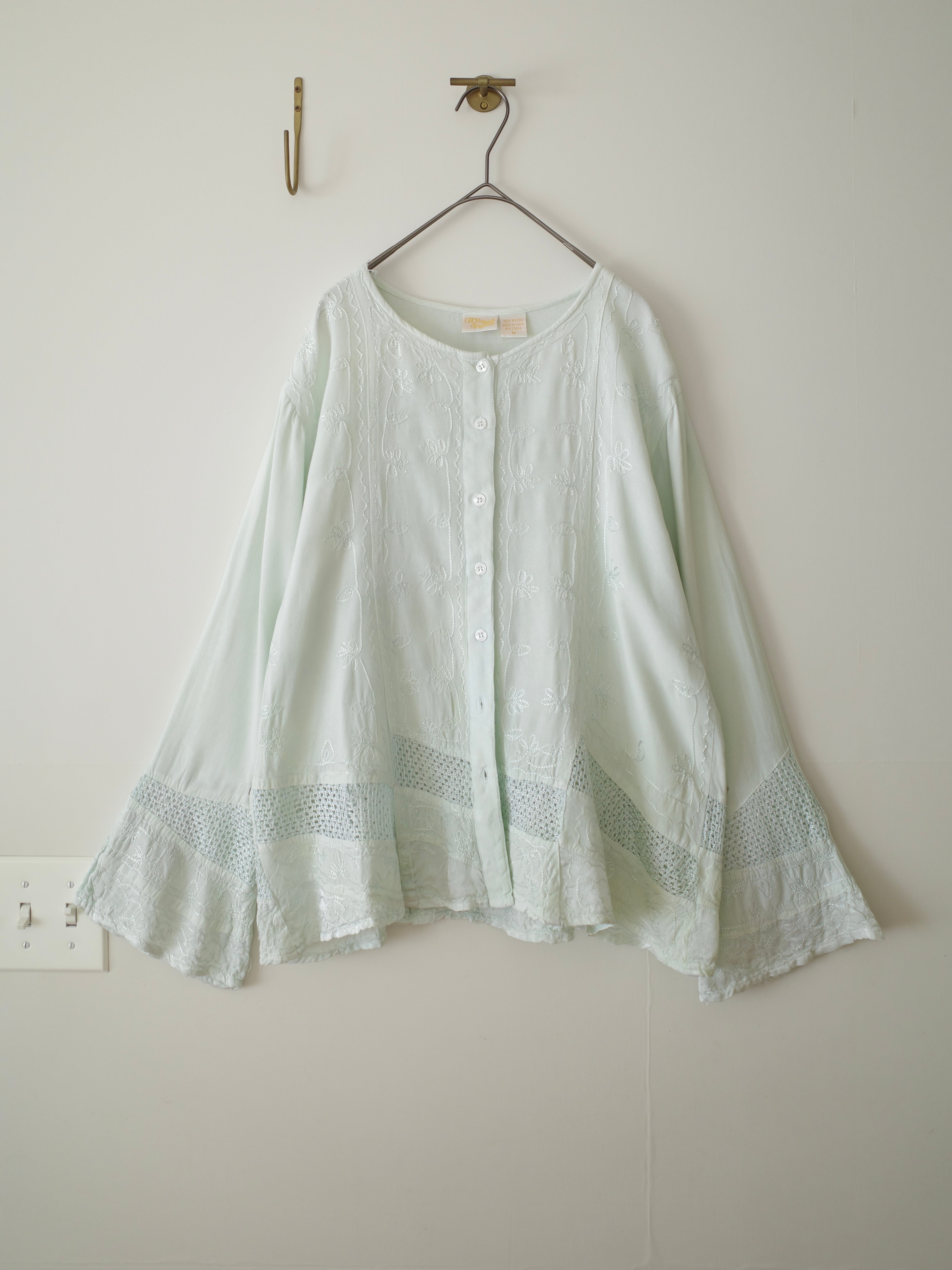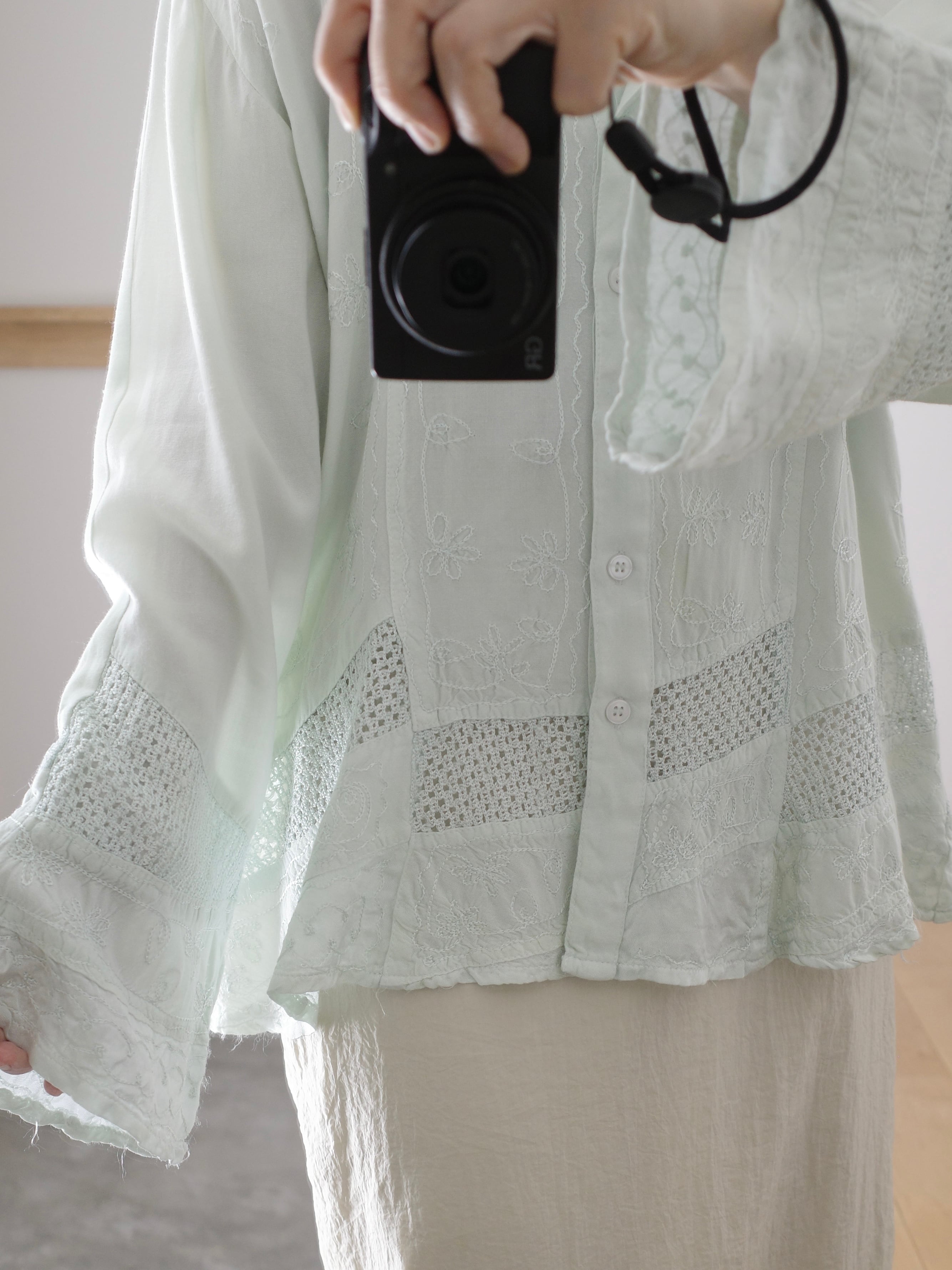 刺繍とメッシュレースのパッチワークが素敵な前開きブラウス。淡いミントグリーンが柔らかな雰囲気で肌映りも最高に良いです!