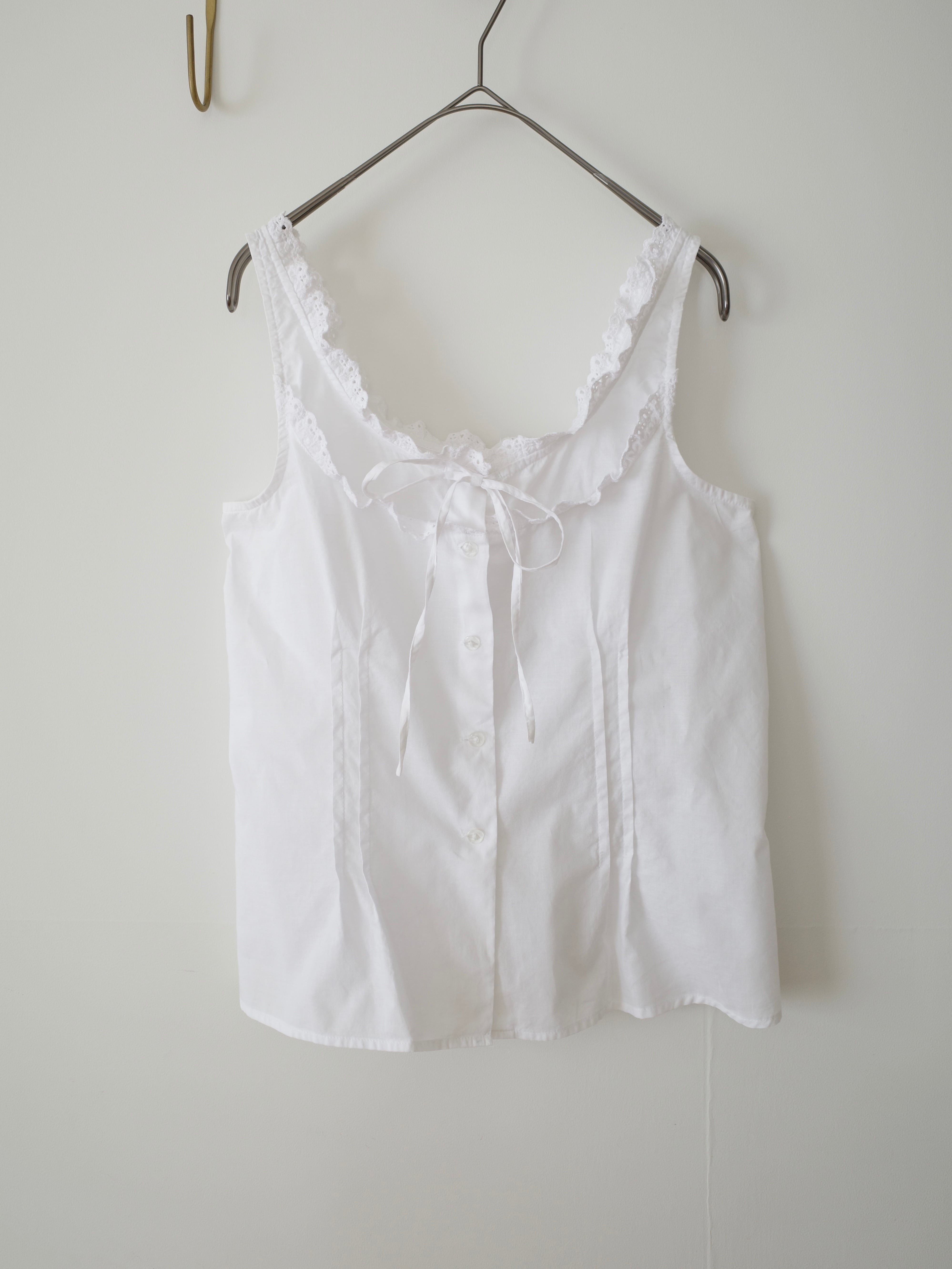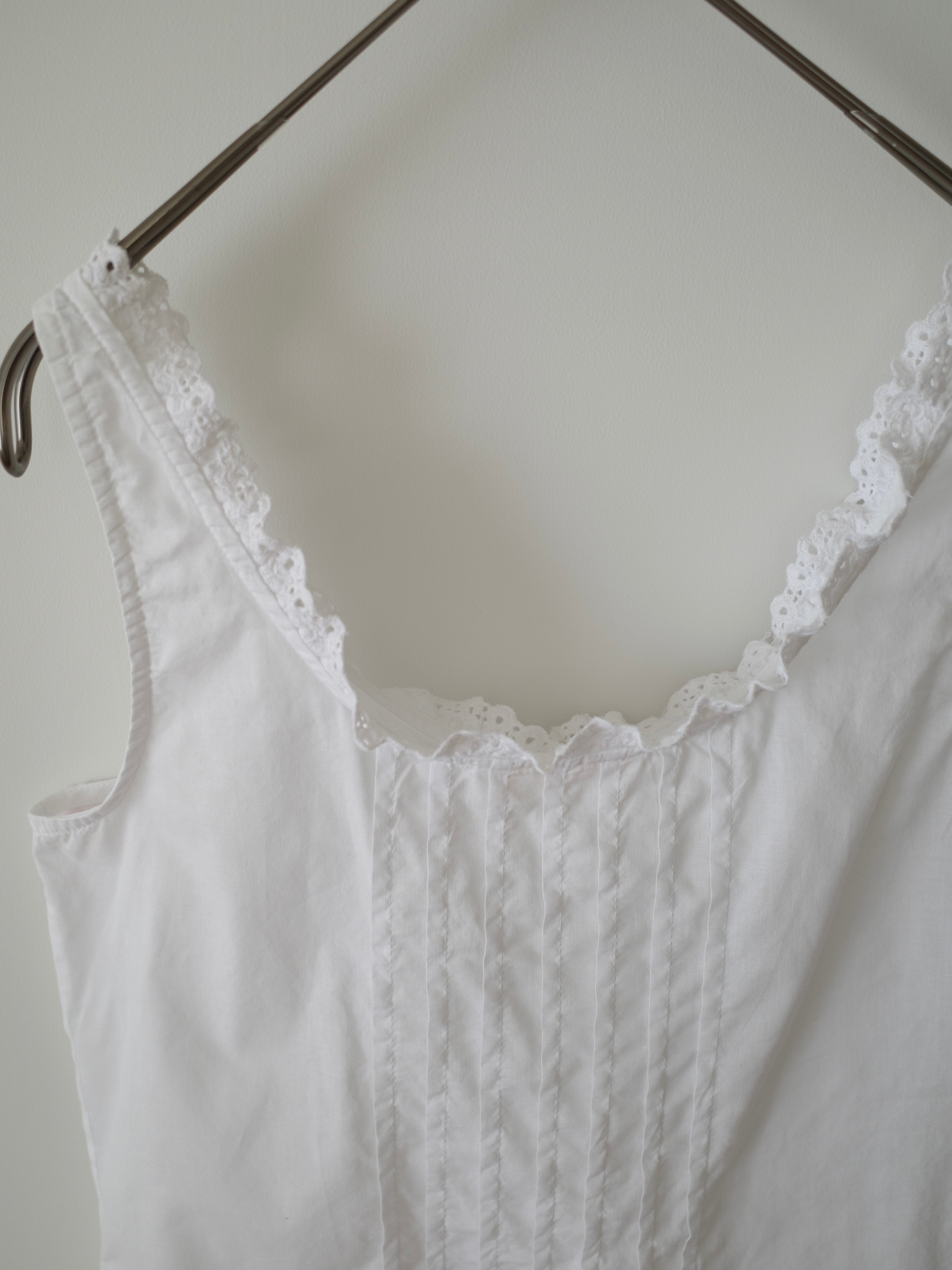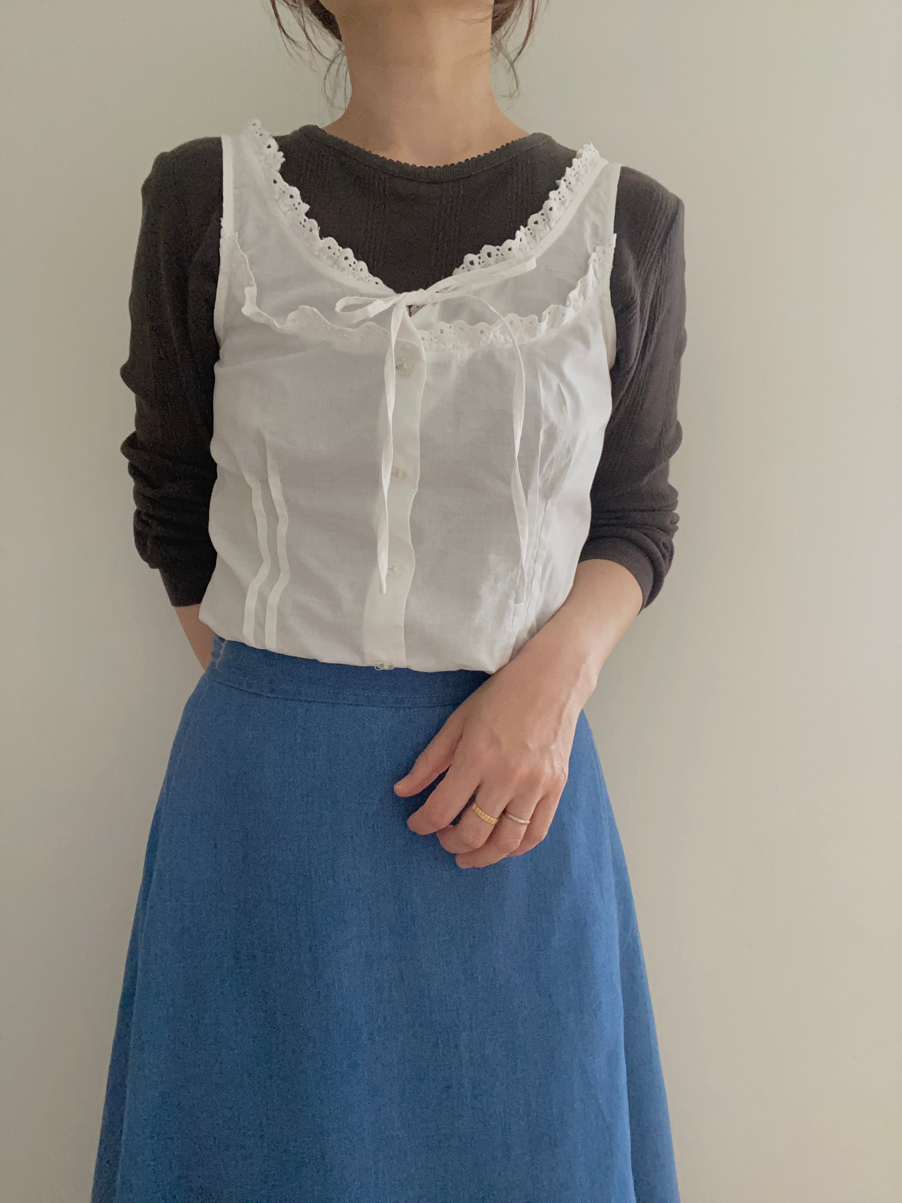 キャミソールタイプのコットンレースビスチェ。1枚で来てももちろん良いですが、襟ぐり大きめなアイテムをTシャツに重ねるの大好きです♡